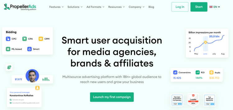 PropellerAds is a global advertising network that focuses on providing targeted traffic to advertisers and monetisation solutions for publishers. They offer a variety of ad formats, including pop-unders, push notifications, native ads, display ads, and more.