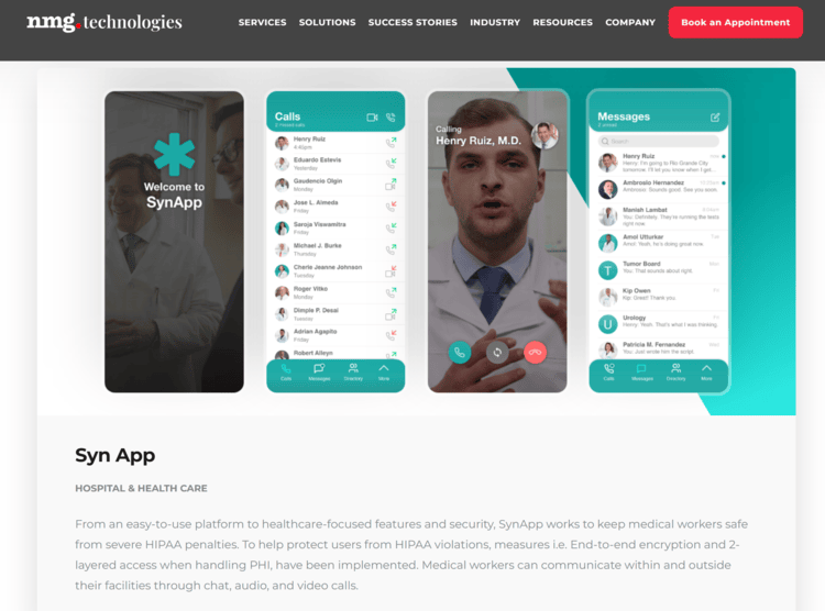 NMG developed the healthcare-focused features and security of SynApp, a mobile app that works to keep medical workers safe from severe HIPAA penalties. To help protect users from HIPAA violations, end-to-end encryption and two-layered access when handling PHI were implemented. Medical workers can now communicate within (and outside) their facilities through chat, audio, and video calls.