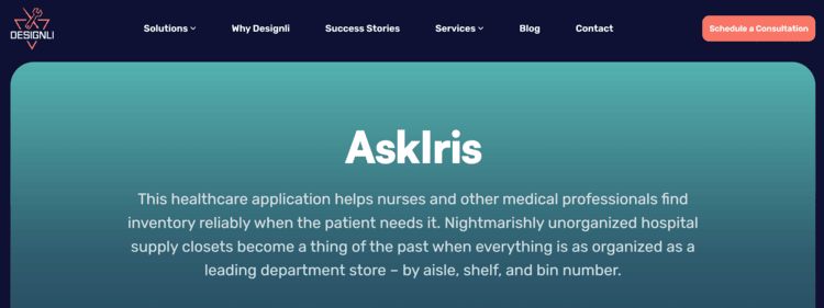 Designli developed AskIris, a healthcare mobile app that allows healthcare professionals to search by voice or text to find what they need immediately. It can also provide low-stock alerts so supply room administrators can order more, as well as enable medical supply admin to manage inventory via CSV with simple uploads and imports instead of manual processes.