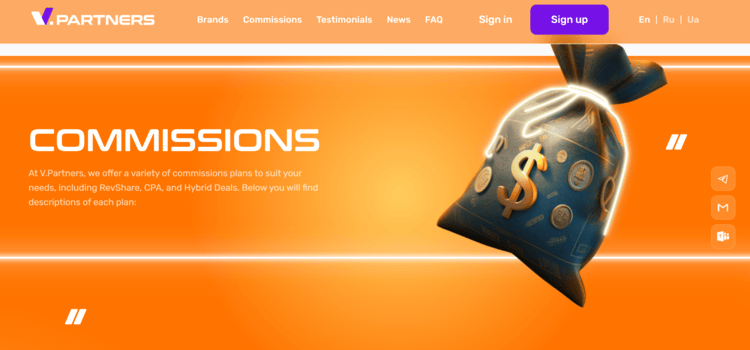 V.Partners provides affiliates with flexible commission models, including Revenue Share up to 50%, CPA up to €350, and hybrid deals.
