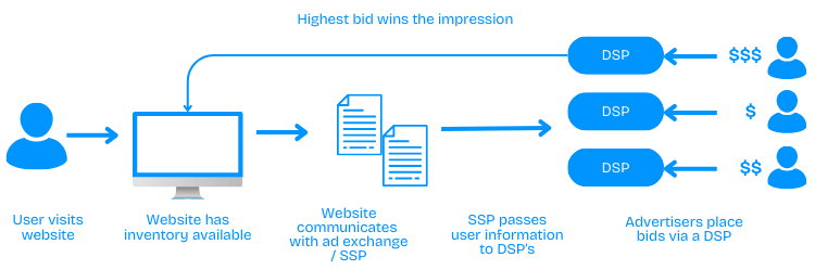 This bidding happens in real-time and is automated by the SSP, DSP and the ad exchange between advertisers and publishers.