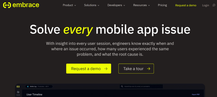 Embrace is a mobile-first performance management platform that helps companies monitor, diagnose, and improve the performance of their apps.