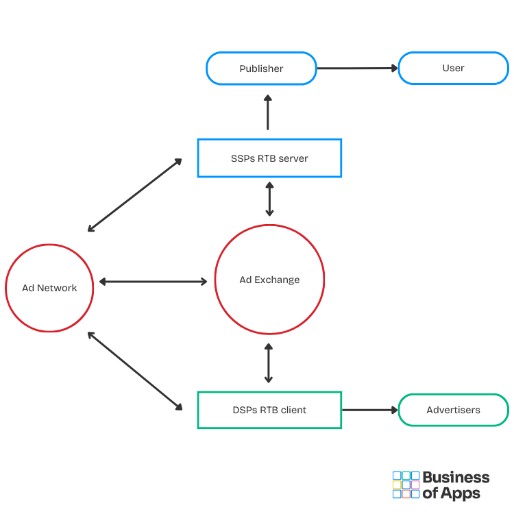 The app advertising process involves key players like DSPs, retargeting, SSPs, a mobile ad network and an ad exchange, which we have illustrated here: